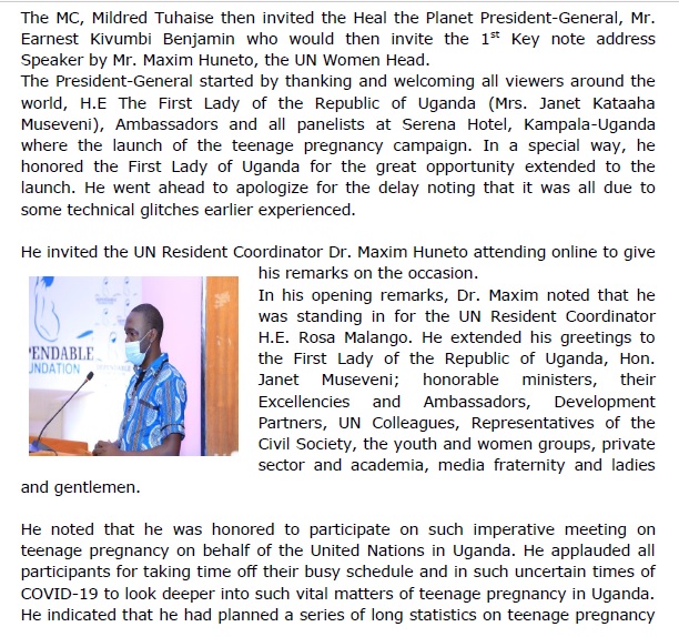 We’re delighted to present The Report for Launch of reach out Project to support Teenage Pregnant Girls organised by Dependable Foundation & Heal The Planet Global Organisation – HTP “In Special Consultative Status with United Nations – UN” The Launch funded by Reproductive Health Uganda, The Danish Family Planning Association – DFPA with support also from BBS Telefayina, UBC & KEB International Group – KIG was hosted at Serena Hotel, Kampala on June Saturday 19th 2021.