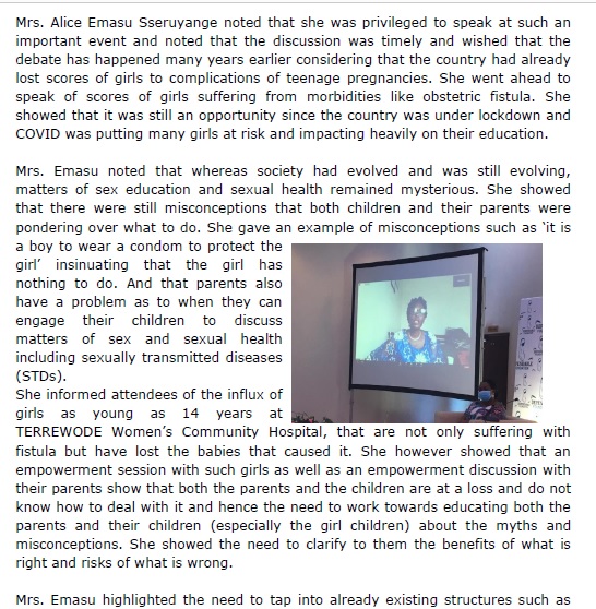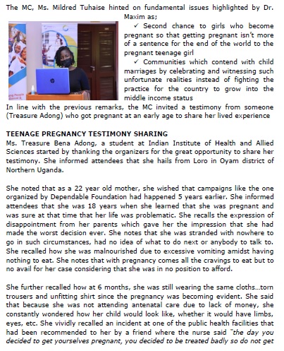 She quoted the deplorable statistics from the 2016 UDHS which highlighted the dire state of adolescent sexual and reproductive health and rights (SRHR) situation including the fact that 25% of adolescent girls between 15-19 years had either already given birth or were expecting their first child. She indicated that that was partly the reason why the discussion around teenage pregnancy was organized by Dependable Foundation and Heal The Planet.