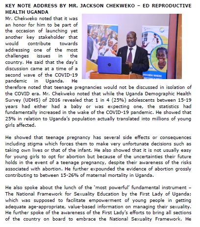 She welcomed everyone online including the distinguished guests and the Guest of Honor, the First Lady of the Republic of Uganda Hon. Janet Kataaha Museveni whom she recognized as having been attending online from inception of the launch event. She encouraged those attending physically to observe the standard operating procedures (SOPs). She informed attendees and participants that the theme was “Rebuilding Broken Walls” in support of ending teenage pregnancy. She highlighted the numerous stories of scores of teenage pregnancy during the first phase of the lockdown as a result of Government directing all efforts to curbing the spread of the pandemic and cutting short the Sexual and Reproductive Health services.